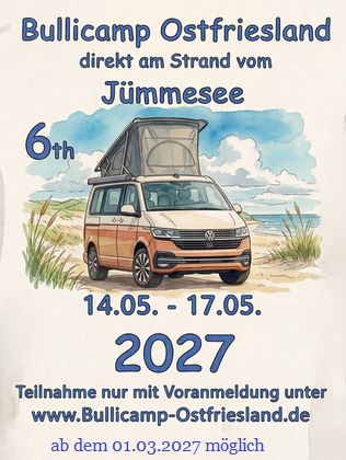 unser sechstes Bullicamp Ostfriesland findet 2027 vom 14.05.2027 bis 17.05.2027 (Pfingsten) wieder in gewohnter Umgebung am Strand vom Jümmesee (auch Stickisee genannt) in Stickhausen / Detern statt. Damit ihr auch garantiert einen Platz für eurem Bulli bekommt, ist eine Teilnahme auch im nächsten Jahr nur mit einer Voranmeldung möglich.